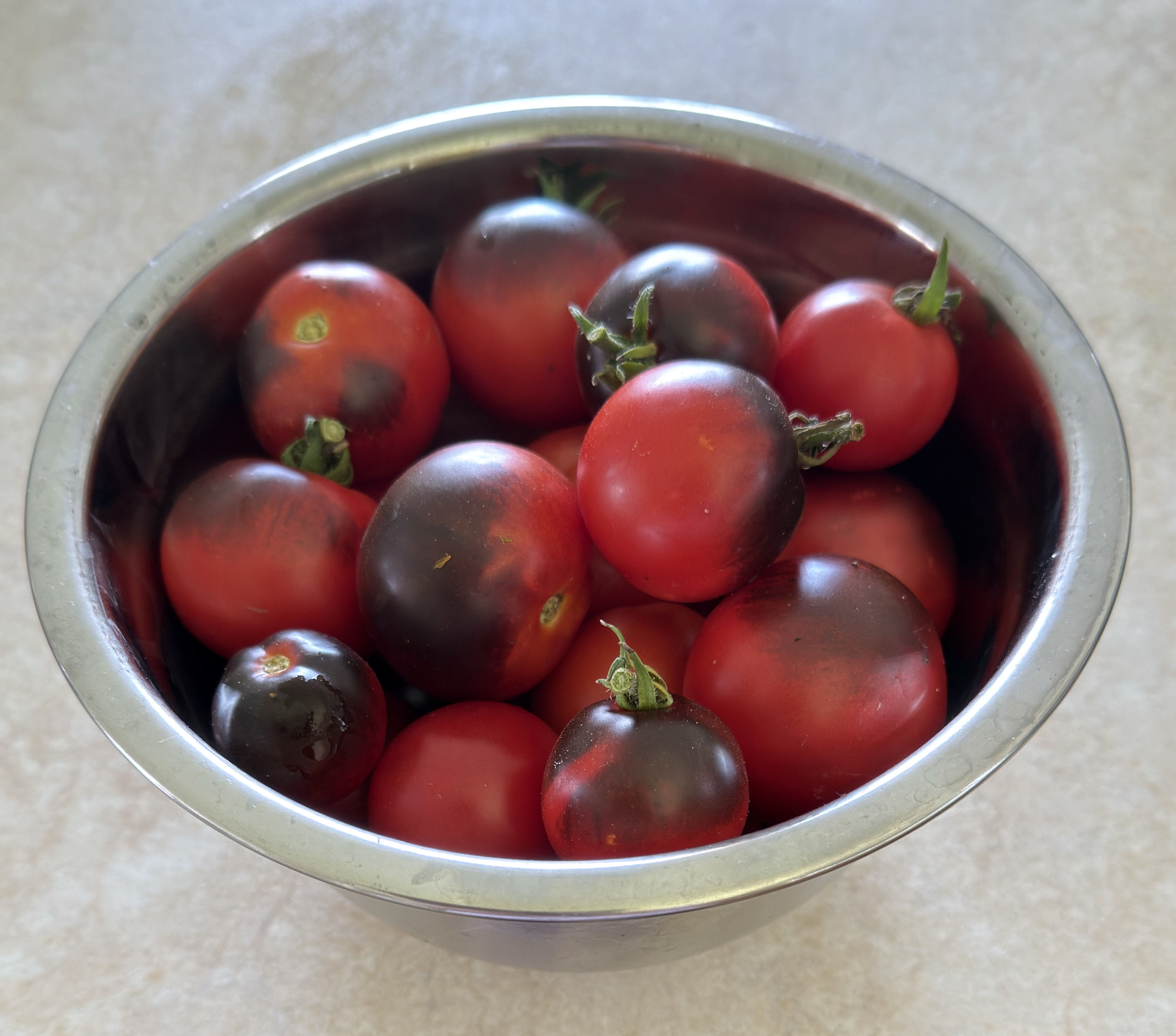 The pollen donor for these varieties comes from Jim Myer's "Indigo Rose" which gives an unusual colouring to the tomatoes from anthocyanins developed  as the fruits are exposed to sunshine. Sometimes the only way to see if the tomatoes are ripe is by looking at the underside for a ripening colour unless checking for softening with a gentle squeeze.